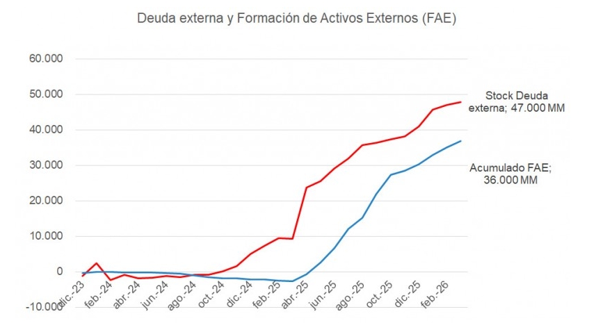 De acuerdo con los datos actualizados a marzo de 2026, desde diciembre de 2023 ingresaron 47.000 millones de dólares netos en concepto de deuda externa, incluyendo desembolsos de organismos internacionales, el Fondo Monetario Internacional y préstamos financieros.