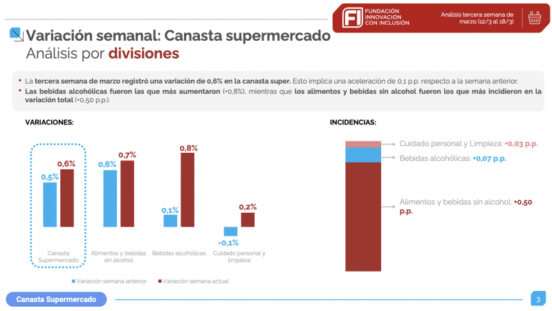 Y sostiene que la dinámica actual confirma ese análisis.Los relevamientos de las consultoras que siguen la inflación ubican la inflación de marzo en en la zona del 3%, confirmando que la suba de precios se instaló en un escalón meas alto. Los alimentos explican buena parte de la aceleración: carnes y lácteos aportaron cerca del 75% de la inflación semanal en marzo. Es un dato clave porque refleja presión en la inflación núcleo, no en los regulados.