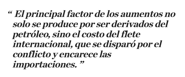 En el sector explican que el principal factor no solo se produce por ser derivados del petróleo, sino el costo del flete internacional, que se disparó por el conflicto y encarece las importaciones.