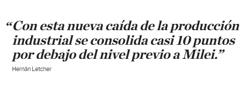 "Con esta nueva caída de la producción industrial se consolida casi 10 puntos por debajo del nivel previo a Milei", indicó Hernan Letcher, director del Centro de Economía Política Argentina (CEPA).