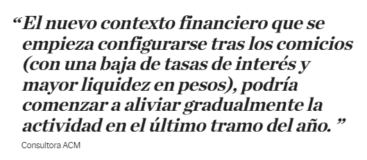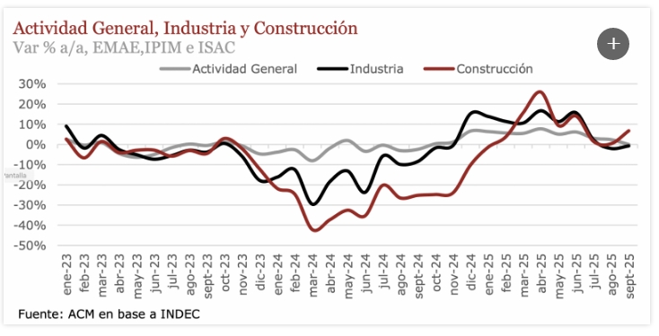 "El nuevo contexto financiero que se empieza configurarse tras los comicios (con una baja de tasas de interés y mayor liquidez en pesos), podría comenzar a aliviar gradualmente la actividad en el último tramo del año. De concretarse, ese efecto se reflejaría primero en una mejor dinámica del consumo y luego en algunos sectores industriales más sensibles al crédito. En este sentido, el último bimestre se perfila con una recuperación al margen, suficiente para compensar parcialmente la caída reciente, aunque probablemente insuficiente para sostener el ritmo acumulado observado hasta ahora. Bajo nuestro escenario base, estimamos un crecimiento industrial anual en torno al 3%", concluyó el trabajo de ACM.