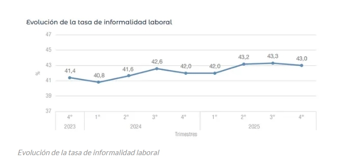 La informalidad laboral alcanzó el 43% en el cuarto trimestre de 2025, según datos del INDEC, lo que implica que millones de trabajadores en Argentina no cuentan con obra social ni aportes jubilatorios. El indicador subió un punto porcentual respecto al mismo período de 2024, en un contexto de creciente deterioro del mercado laboral.