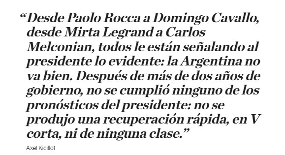 El primero en cruzar fuerte al gobierno fue Axel Kicillof en su discurso de apertura de sesiones de este lunes: "Desde Paolo Rocca a Domingo Cavallo, desde Mirta Legrand a Carlos Melconian, todos le están señalando al presidente lo evidente: la Argentina no va bien. Después de más de dos años de gobierno, no se cumplió ninguno de los pronósticos del presidente: no se produjo una recuperación rápida, en V corta, ni de ninguna clase".