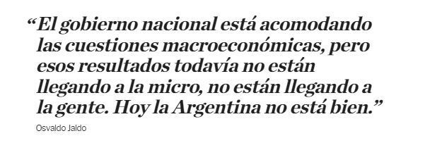 Jaldo, que ayudó a Milei a aprobar la reforma laboral y mantiene la línea de apoyo al gobierno libertario, agregó: "El gobierno nacional está acomodando las cuestiones macroeconómicas, pero esos resultados todavía no están llegando a la micro, no están llegando a la gente. Hoy la Argentina no está bien".
