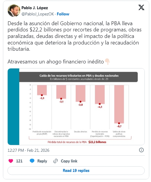 Su ministro de Economía, Pablo López, fue directo: "En febrero, la coparticipación a la PBA y el conjunto de provincias cayó un dramático 9% real. Se profundiza el círculo vicioso del modelo nacional: licuación de ingresos, caída del consumo, destrucción de empresas y empleo, y menor recaudación".