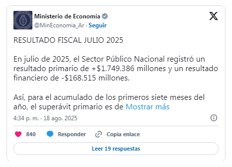 El Ministerio de Economía informó que las cuentas públicas tuvieron déficit financiero en julio por $168.515 millones. La baja se debió al pago de intereses de deuda y el aguinaldo de estatales, siendo el primero del año y el segundo en la gestión de Javier Milei. Como contrapartida, se mantuvo el superávit primario en 1,7 billones de pesos.