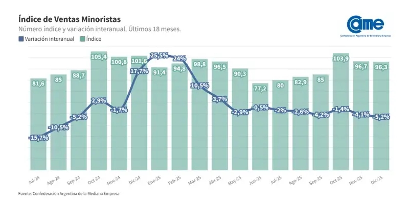 Al analizar el escenario relevado, desde CAME sostuvieron que "diciembre funcionó como un alivio financiero gracias a las fiestas de fin de año y al cobro de aguinaldos, pero no logró revertir la caída estructural del 5,2%".