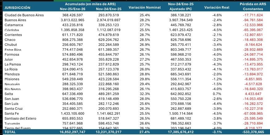 Las provincias tuvieron una variación nominal positiva de entre el 25 y el 33%, pero al ajustar por inflación, prácticamente todas sufrieron una variación real negativa.