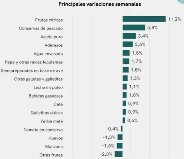 - Frutas: aumentaron 1,7%, con picos de hasta 11,2% en cítricos