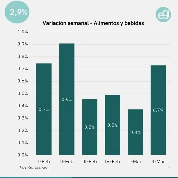 El seguimiento difundido por EcoGo señala que "durante la segunda semana del mes los precios de los alimentos consumidos dentro del hogar registraron una suba de 0,7%". A partir de ese comportamiento, el informe estima que "la inflación de los alimentos dentro del hogar se proyecta en torno al 2,1% para marzo".