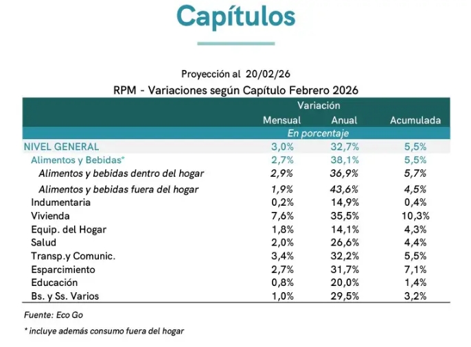 Con todas las categorías relevadas, la consultora proyectó que la inflación general de febrero se ubicará en torno al 3% mensual. En el desagregado por capítulos, alimentos y bebidas exhiben una variación mensual estimada de 2,7% y un alza interanual de 38,1%. El nivel general, en tanto, muestra una suba acumulada de 5,5% en lo que va del año.