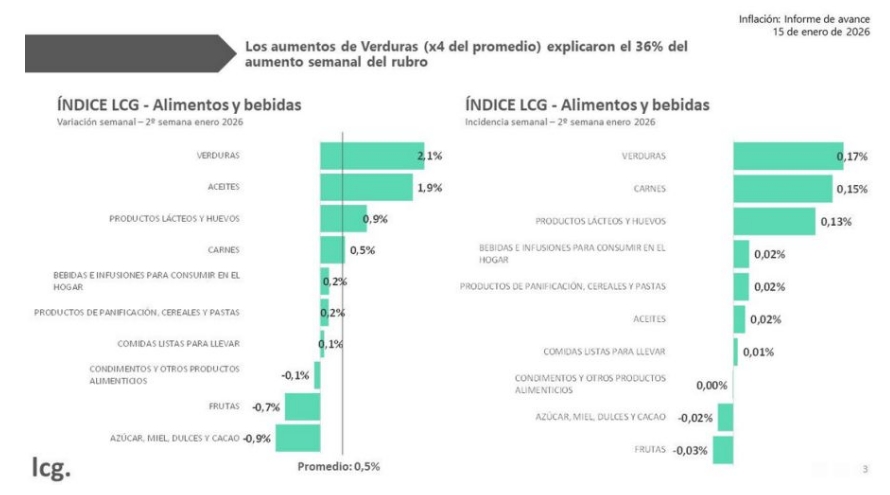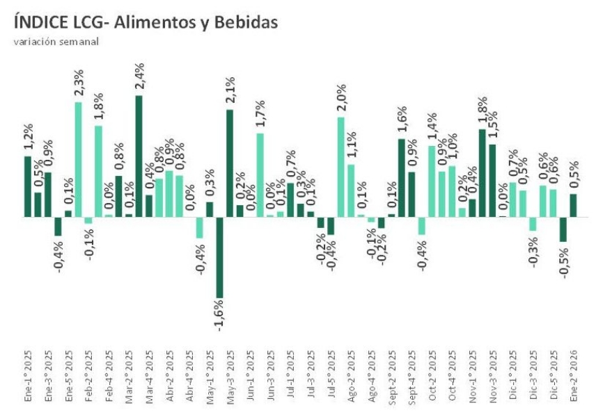 En la segunda semana de enero del 2026, la inflación promedio en alimentos y bebidas aumentó un 0,5%, según lo indicó un informe privado realizado por la consultora Labour, Capital & Growth (LCG). Detalló además que, en las últimas cuatro semanas, se desaceleró a 1,1% mensual.