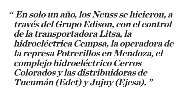 En solo un año, los Neuss se hicieron de activos de un valor incalculable: se quedaron con el control de la transportadora Litsa, la hidroeléctrica Cempsa, la operadora de la represa Potrerillos en Mendoza, el complejo hidroeléctrico Cerros Colorados y las distribuidoras de Tucumán (Edet) y Jujuy (Ejesa).