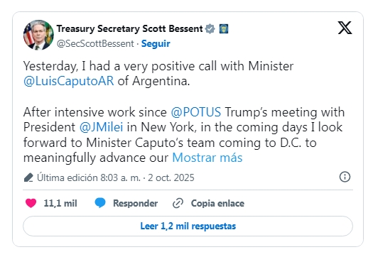 Temprano este jueves, el funcionario norteamericano aseguró haber mantenido "una llamada muy positiva con el ministro Luis Caputo". y adelantó que esperaba "con ansias" la llegada del equipo argentino a Washington para avanzar en las discusiones sobre "las opciones para brindar apoyo financiero".