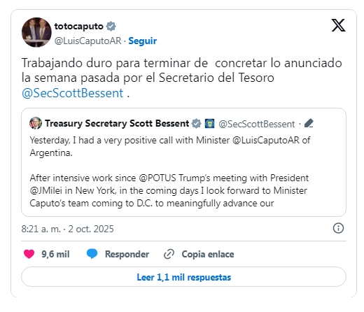 Es que el nuevo posteo de Bessent - y la ronda de encuentros - es una prueba para ver si logra el efecto de aquietar los mercados, aunque algunos operadores dicen que la frase que más se escucha hoy día es "show me the money" (mostrame el dinero), lo que apunta a la necesidad de ver las ayudas confirmadas oficialmente por Estados Unidos. "El Gobierno argentino no está colaborando todo lo necesario para que los ayudemos", señalan en Washington y ponen en duda la capacidad de gobernabilidad del líder libertario.