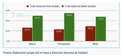 En concreto, las estadísticas de 2019 revelan que ese añoel 49,7% de los kilómetros relevados de rutas nacionales pavimentadas se encontraban en estado "bueno", mientras que 24% estaban en situación "regular" y 26,3% en estado "malo". En continuidad, en 2022, el informe al que accedió este medio indicó que el 54,9% de los kilómetros inspeccionados calificaban en buen estado, 23% en estado regular y la fracción de la red en estado "malo'' se redujo a 23%. Los datos de la actual administración libertaria indican que la proporción de rutas en buen estado cayó al 47,5% (-7,4 puntos vs. 2022) mientras que 23,5% quedaron en estado regular y 29% en mal estado. En otras palabras, "ahora un tercio de la red está en malas condiciones y menos de la mitad de las rutas se encuentran en estado óptimo".