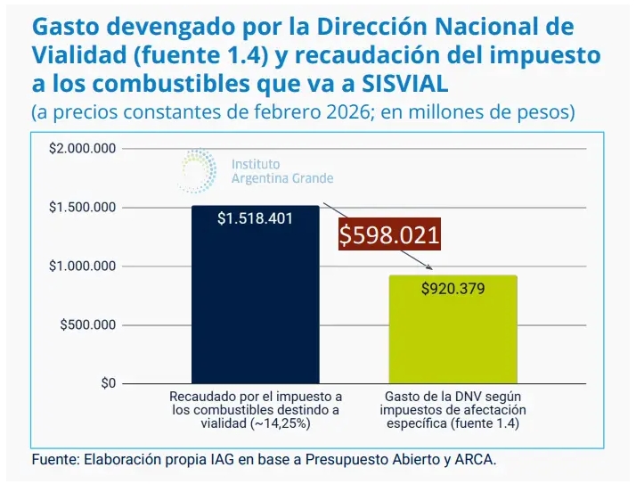 Los economistas explicaron que el gasto que hace Vialidad a cuenta de la fuente de ingresos de fideicomisos (fuente 1.4 según el Informe del Jefe de Gabinete N° 140) no acompañó lo recaudado por el impuesto a los combustibles que debe dedicarse al mantenimiento del sistema vial nacional. Mientras que el 14,25% de lo recaudado por el impuesto desde el cambio de gestión totaliza un $1.518.401 millones (a precios de febrero 2026), la DNV gastó $920.578 millones, un 39,8% menos. "Esta diferencia ($598.021 millones) abulta el superávit del que el gobierno se jacta, pero hace que el estado de las rutas empeore cada vez más", aseguraron.