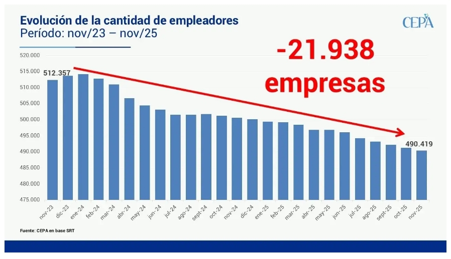 En diciembre de 2023, el Boletín Estadístico de la Superintendencia de Riesgos del Trabajo (SRT)arrojaba un total de 512.898 compañías a lo largo y ancho del territorio. El último reporte conocido este mes -que toma los números a noviembre de 2025- indica que hay 490.419 empresas. Es decir que, según los datos oficiales, hubo 22.479 unidades productivas que tuvieron que cerrar desde que Milei es presidente.