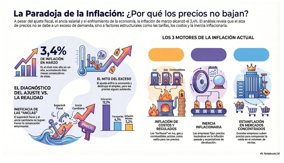 Si el salario sube por debajo de la inflación, si el tipo de cambio oficial lleva meses prácticamente estable, si el superávit fiscal se mantiene pese a las presiones sobre las cuentas públicas con caída de la recaudación impositiva en términos reales durante ocho meses consecutivos, y si la recesión del mercado interno frena la demanda que podría presionar sobre los precios, ¿por qué la inflación no baja?, ¿por qué en marzo de 2026 trepó a 3,4%, el nivel más alto en un año, más que duplicando el 1,5% de mayo pasado? y ¿por qué acumula diez meses de alzas consecutivas?