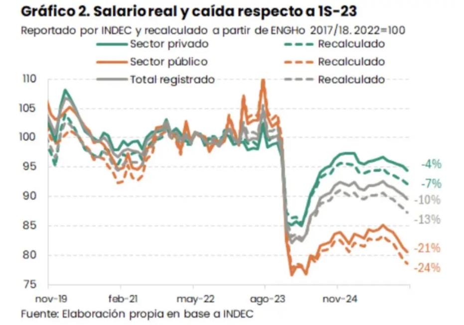 No obstante, el equipo liderado por el economista Joaquín Waldman puso la lupa en el impacto "mayor" que la desactualización del índice general de precios provoca en los salarios de la población. Al recalcular la pérdida del poder adquisitivo de los salarios utilizando el IPC con ponderadores nuevos, la caída respecto del promedio del primer semestre de 2023 pasa de -10% a -13%. Dentro de esta caída contrastan los salarios del sector privado, cuya contraccón se habría casi duplicado (siendo -7% en lugar de -4%), y los del sector público, que habrían caído -24% en vez de -21%.
