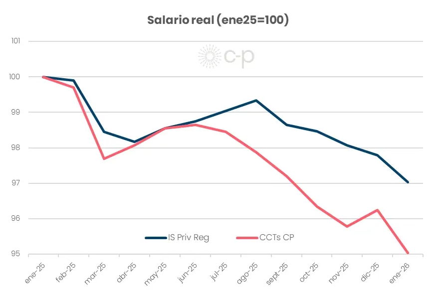 "A fines de 2025 la pauta oficial de 1–1,5% mensual había quedado desbordada. Las negociaciones ya se ubicaban entre 2% y 2,5%. Sin bien en ningún momento los salarios lograron superar la inflación, por lo que el salario real continuó cayendo, la nominalidad subía y el gobierno había perdido la iniciativa", analizó el economista Federico Pastrana, director de la consultora C-P. Según consideró en un informe reciente, el gobierno intenta imponer un nuevo techo del 2%.