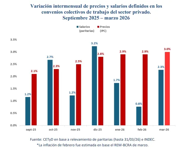 Por su lado, el informe de coyuntura laboral de abril del Centro de Capacitación y Estudios sobre Trabajo y Desarrollo (CETYD-UNSAM) mostró igualmente que los salarios del sector privado quedaron rezagados respecto de la inflación en los primeros meses de 2026: los aumentos negociados en paritarias de enero (+1,7%) y febrero (+0,8%) corrieron por detrás del incremento de precios (+2,9% en cada mes).