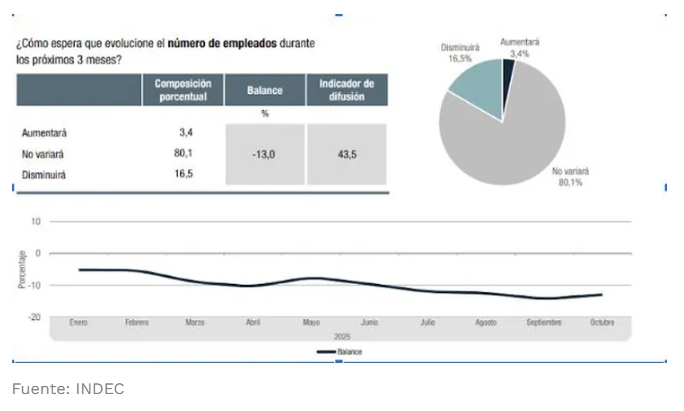 Un dato para tener en cuenta del último informe del INDEC es el aumento en la cantidad de empresas industriales que pensaban en noviembre reducir personal dentro de los próximos tres meses– el 16,5% de los consultados –, contra sólo 3,4% que proyectaban aumentar la planta.
