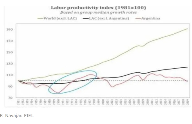 Pero los economistas también ponen en la balanza que la incorporación de maquinarias y tecnología es un proceso en el que el país debe avanzar para romper el estancamiento que viene padeciendo la economía. Al respecto, un trabajo del economista Fernando Navajas de FIEL resulta contundente: con oscilaciones, la productividad laboral en el país se mantiene en torno de los mismos niveles alcanzados en … 1981.