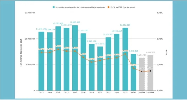 La inversión nacional representa alrededor del 25% del presupuesto educativo público y el restante 75% corresponde a las provincias. Desde 2015, cuando se alcanzó un pico de 1,59% del PBI, la inversión en educación muestra una caída constante, donde el gasto real pasó de $12,9 billones (constantes 2025) a $6,2 en 2025. Para 2026, el Gobierno proyecta una leve recuperación de 8% en términos reales (de hasta $6,8 billones) aunque en un contexto general de contracción y ajuste del gasto público.