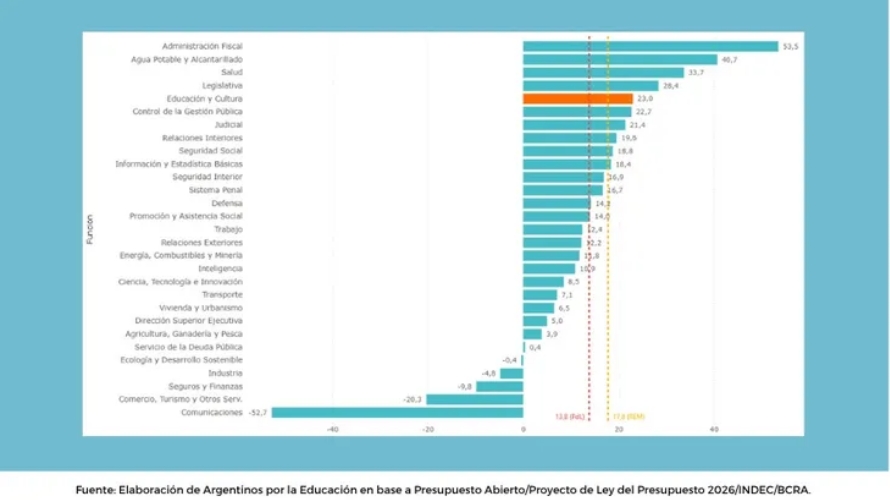 Dentro del nuevo esquema la Secretaría de Educación exhibe un aumento nominal del 17,9%, lo que implica una suba real de solo 3,6% según la inflación estimada en el propio Presupuesto 2026 (13,8%). En términos relativos, el área educativa pierde peso dentro del gasto total: su participación en la función "Educación y Cultura" caerá del 85% al 81,7%.