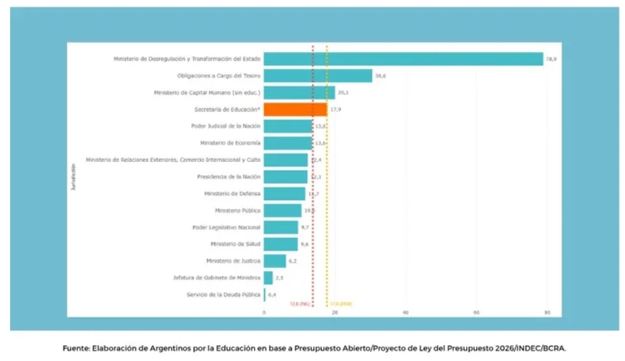 Los datos surgen del informe "Presupuesto educativo nacional 2026", de Argentinos por la Educación, elaborado por Javier Curcio (FCE/UBA, IIEP - UBA CONICET), María Sol Alzú y Martín Nistal, donde analizaron el proyecto de la "ley de leyes" que ingresó al Congreso el mes pasado. En el relevamiento, los especialistas tomaron en cuenta los gatos de la Secretaría de Educación del Ministerio de Capital Humano, sumado a las erogaciones destinadas a la función "Educación y Cultura" (que corresponden en un 80% a la Secretaría, pero abarcan también recursos de otros ministerios como Defensa e Infraestructura).