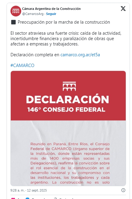 La Fundación le atribuyó esta contracción a la suspensión de inversión en obra pública del Gobierno y a la ausencia de financiamiento a largo plazo para el sector privado. El informe señaló que "estas caídas con respecto a 2023 son profundas" y que para dinamizar al sector debe retornar la obra pública, aunque bajo esquemas de financiación distintos a los tradicionales. En consonancia, CAMARCO también reclamó medidas urgentes, como recomponer la cadena de pagos, reducir las cargas fiscales y habilitar líneas de crédito que permitan sostener la actividad y frenar la sangría de empleos. "Sin una respuesta inmediata, el margen de resistencia de las empresas está agotado. La crisis demanda una acción política y económica decidida para evitar un colapso de mayores proporciones", cerró.