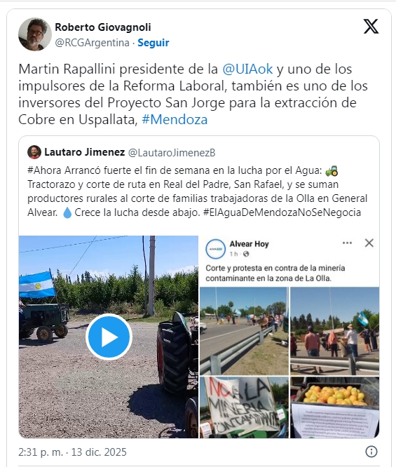 Como tantos empresarios con hiper concentración de poder y negocios en Argentina, el de Martín Rappallini es un nombre que reúne en una sola persona varias iniciativas de saqueo. Es presidente de la Unión Industrial Argentina (UIA) en un contexto crítico para las industrias producto de las políticas de ajuste y apertura de importaciones de Milei. A pesar de ello, es uno de los principales impulsores de la regresiva Reforma Laboral del gobierno de Javier Milei que busca quitar o limitar derechos laborales al conjunto de la población trabajadora. También, es uno de los dueños del Proyecto San Jorge para la extracción de cobre en Uspallata, que resiste el pueblo de Mendoza con masivas movilizaciones en defensa de su territorio y del agua. Compartimos el perfil de alguien cuya figura sintetiza varios de los puntos álgidos de lucha y movilización del momento.