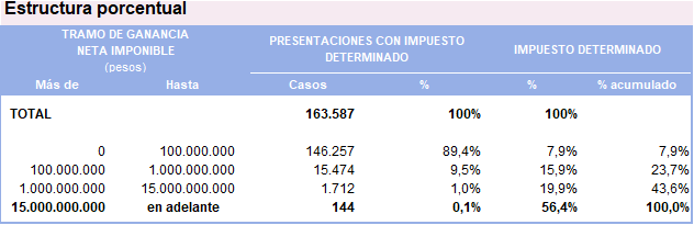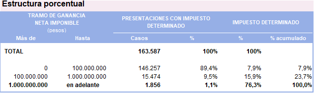 Esta información surge de las estadísticas públicas del organismo recaudador. En el cuadro 2.3.3.3.1. de "Impuesto a las Ganancias Sociedades" se segmenta esa información y permite deducir la estructura porcentual por tramo de ganancia neta.