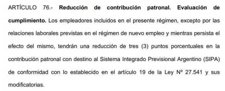 En el artículo 76 de la reforma explicita el beneficio a la patronales del Gobierno, que de esta manera le trasladará al Estado el costo de los despidos y genera un caída en la recaudación destinada al pago de las jubilaciones y pensiones del Sistema Integrado Previsional Argentino (SIPA) de Anses.