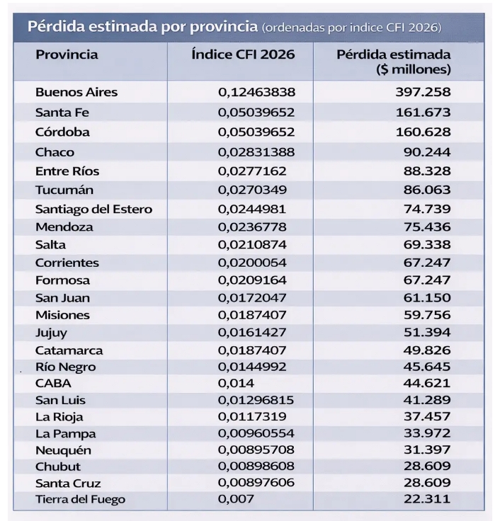 Así las cosas, las pérdidas alcanzan a las 24 jurisdicciones y suman varios billones de pesos, con efectos desiguales pero generalizados sobre las economías provinciales: encabeza el ranking la provincia de Buenos Aires, con una pérdida estimada de $397.258 millones. Le siguen Santa Fe, que pierde $161.673 millones y Córdoba, con un recorte de $160.628 millones.