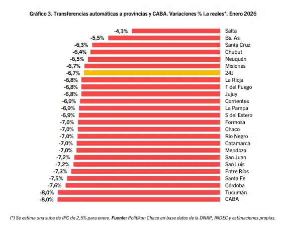 Según los últimos datos a enero de este año, las transferencias automáticas de recursos de origen nacional distribuidas las provincias y CABA totalizaron 5,85 billones de pesos, dando cuenta de una caída real –considerando el impacto de una inflación estimada del 2,5% para enero- del 6,7% interanual. A su vez, contra el mes previo también mostraron un retroceso, aunque más leve (-0,7% real mensual). En consecuencia, según la consultora Politikon Chaco, las transferencias automáticas de enero se convirtieron en el segundo peor enero desde, al menos, 2017, ubicándose únicamente por encima del registro de ese mes de 2024 (+4,9%).