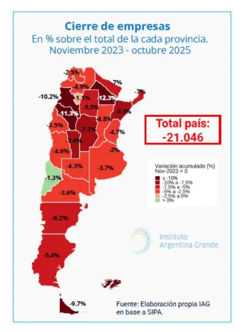 La contracción de recursos se da a la par de una destrucción sistemática del aparato productivo con la consecuencia pérdida de puestos de trabajo en todas las regiones del país. En detalle, la destrucción de empresas se evidencia en los distintos territorios. Según un informe del Instituto Argentina Grande (IAG), en términos absolutos se concentra en los principales centros económicos: Buenos Aires (-5.621), Córdoba (-3.696) y CABA (-2.409) que lideran la caída.
