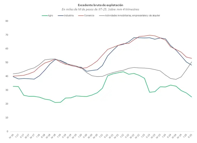 En el caso del comercio, la pérdida fue de 24% contra el pico registrado en el segundo trimestre de 2023. En el caso de la industria, la caída fue del 30%. El agro, por su parte, está 42% por debajo del pico de 2022 y continúa deteriorándose pese a la recomposición luego de la sequía.