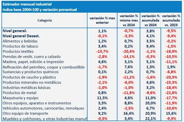 En septiembre la producción industrial cayó 0,1% mensual desestacionalizado, variación explicada por una caída de 11,7% mensual del Sector textil seguida de una baja del 2,8% en Prendas de vestir cuero y calzado. Respecto del mismo mes del año 2024, la contracción general fue del 0,7% y se debió principalmente a esos mismos sectores (-20% y -11% respectivamente), sumado a las mermas en Caucho y plástico, y en Productos de metal (-11,0%).