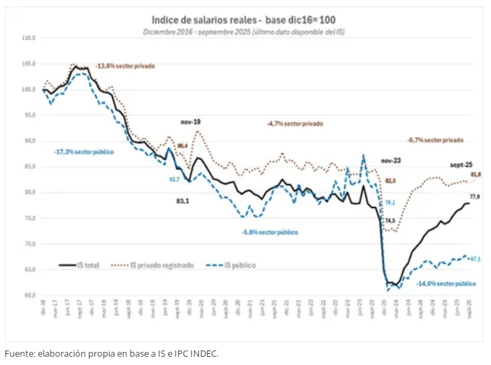 Cabe destacar que el índice total incorpora también al componente de asalariados privados no registrados, estimado a partir de la Encuesta Permanente de Hogares (ENGHo). Entre diciembre de 2016 y el último dato disponible, este componente mostró una baja real del 15,6%. Esta "menor caída real" debe leerse con reservas por razones metodológicas: el salario privado no registrado presenta un rezago de cinco meses, por lo que el dato de septiembre de 2025 corresponde en realidad a abril de 2025. Corrigiendo ese rezago, la caída real entre diciembre de 2016 y abril de 2025 asciende al 17,8%, mientras que para el mismo período el IS total recalculado corrigiendo el rezago del componente no registrado muestra una baja real del 23,1%.