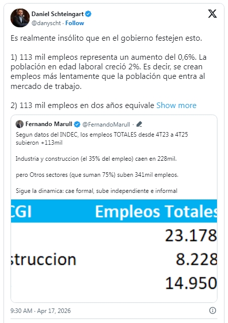 Pero el problema no es sólo el salario. También aparece el frente del empleo. Ahí se abre una discusión interesante. El filo oficialista Fernando Marull destacó que, según datos del Indec, los empleos totales crecieron en 113 mil entre el cuarto trimestre de 2023 y el cuarto trimestre de 2025. Pero ese número es engañoso si se lo pone en contexto.