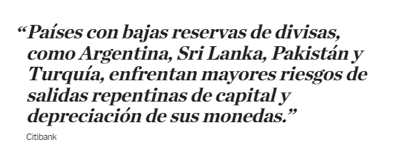 El Citi fue el primero en advertir que la Argentina está complicada. El banco señaló que "países con bajas reservas de divisas, como Argentina, Sri Lanka, Pakistán y Turquía, enfrentan mayores riesgos de salidas repentinas de capital y depreciación de sus monedas", ante la crisis global.