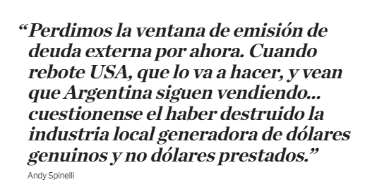 El economista Andy Spinelli lanzó una crítica directa en redes: "¿A que hoy ningún medio maneja riesgo país? Perdimos la ventana de emisión de deuda externa por ahora. Cuando rebote USA, que lo va a hacer, y vean que Argentina siguen vendiendo... cuestionense el haber destruido la industria local generadora de dólares genuinos y no dólares prestados. Y rajen a esta gestión económica. Los dejó atrapados a todos en una crisis externa, totalmente esperada. No es inesperada".