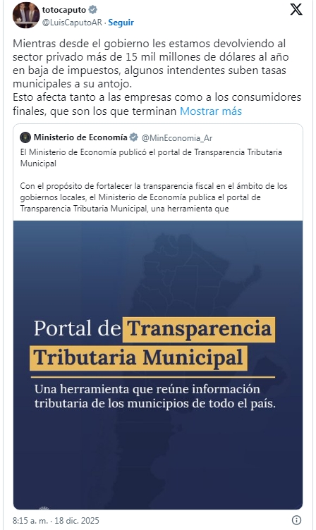 Caputo acompañó la presentación con un mensaje en redes sociales. "Mientras desde el Gobierno les estamos devolviendo al sector privado más de 15 mil millones de dólares al año en baja de impuestos, algunos intendentes suben tasas municipales a su antojo", escribió. Y añadió: "Esto afecta tanto a las empresas como a los consumidores finales, que son los que terminan pagando el costo de administradores irresponsables".