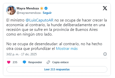 Al conocerse la iniciativa hubo una rápida reacción desde el ámbito bonaerense. Como dio cuenta Buenos Aires/12 la diputada provincial y exintendenta de Quilmes, Mayra Mendoza, calificó el sitio como un nuevo ataque a los jefes comunales: "Pierden el tiempo con una web para 'publicar las tasas municipales', atacando a quienes día a día contienen en el territorio los desastres que él y el presidente Milei hacen. Mafiosos e impresentables".