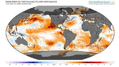 El 31 de marzo, el 23% del océano mundial (entre los 60°S y los 60°N) se vio afectado por olas de calor marinas.La mayoría de estas olas de calor marinas se desarrollaron recientemente, con un 17% del océano global (entre 60°S y 60°N) afectado por olas de calor marinas de menos de 1 mes de antigüedad y un 4% por eventos de entre 1 y 2 meses de antigüedad.