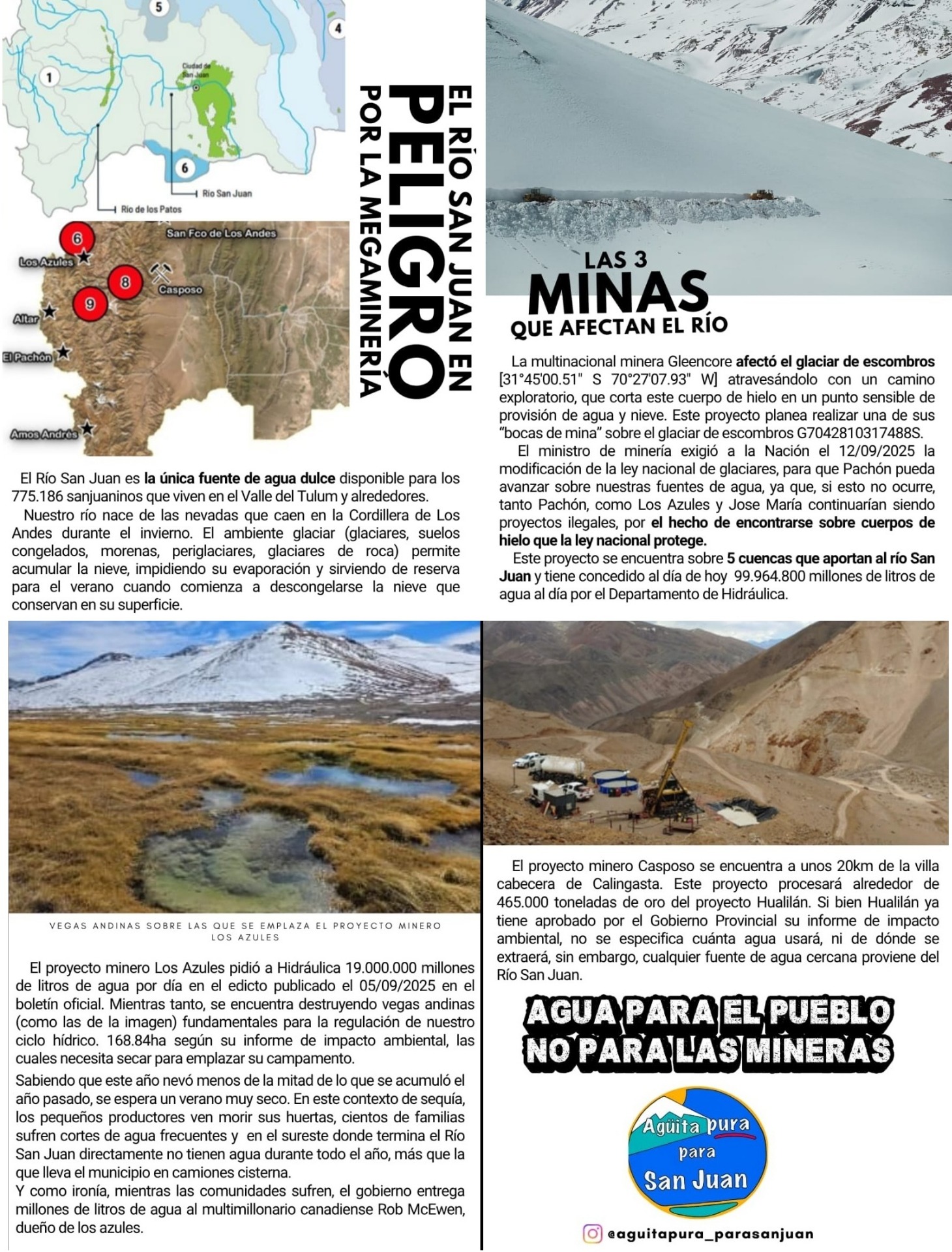 La Asamblea Agüita pura para San Juan también se hizo presente llevando su importante colaboración de agua y en la jornada distribuyeron folletos esclarecedores sobre el problema que se suma a toda esta crisis y que es el de la megaminería que además del uso de millones de litros de agua, éstos no son tratados ni reutilizados y suman contaminación más los peligros de los derrames de sustancias tóxicas como ocurrió en 2015, cuyo tratamiento judicial todavía duerme en los tribunales y los efectos de la contaminación la padecen diariamente en la ciudad de Jáchal ya que las empresas no cumplen con la Ley General del Ambiente, no cumplen con la Ley de Residuos Peligrosos, ni con el Seguro Ambiental Obligatorio.