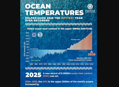 El contenido de calor global de los océanos y mares, OHC, alcanzó un máximo histórico por noveno año consecutivo en 2025