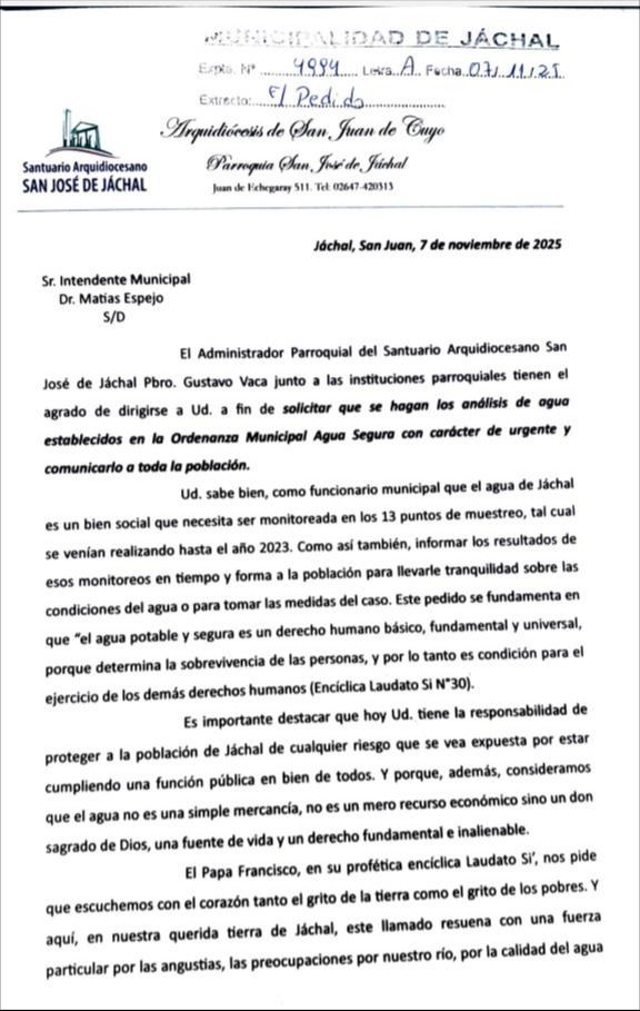 El texto presentado por el sacerdote no deja lugar a interpretaciones: "Solicitamos que se hagan los análisis de agua establecidos en la Ordenanza Agua Segura con carácter de urgente y comunicarlo a toda la sociedad", señala el escrito, que además recuerda al jefe comunal que "el agua de Jáchal es un bien social que necesita ser monitoreado" y que los resultados deben publicarse "en tiempo y forma para llevar tranquilidad a la población o para tomar las medidas del caso".